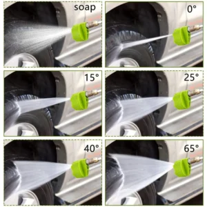 Adjustable Nozzle: Pressure washer nozzle tips has 6 different angles of spraying: 0 degree, 15 degree, 25 degree, 40 degree, rinse and soap. According to your need, you can use pressure washer tip for different purposes and Save you a lot of energy.