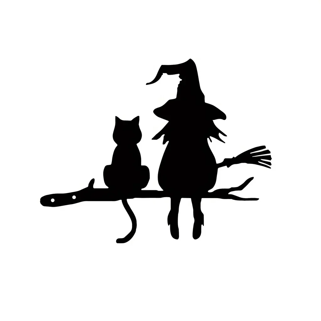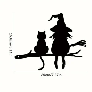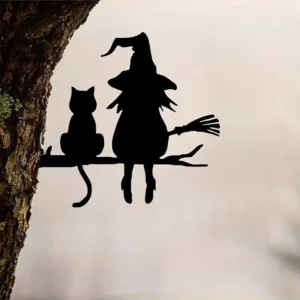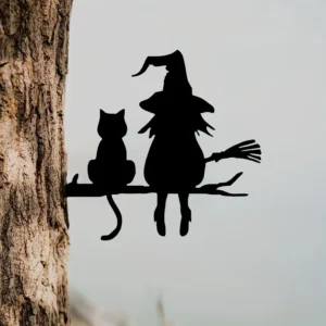 Metal Silhouette Cute Witch And Cat Garden Stake On The Branch Yard Art Decor, Tree Stump Plug-in, For Garden Lawn CourtyardMetal Silhouette Cute Witch And Cat Garden Stake On The Branch Yard Art Decor, Tree Stump Plug-in, For Garden Lawn Courtyard
